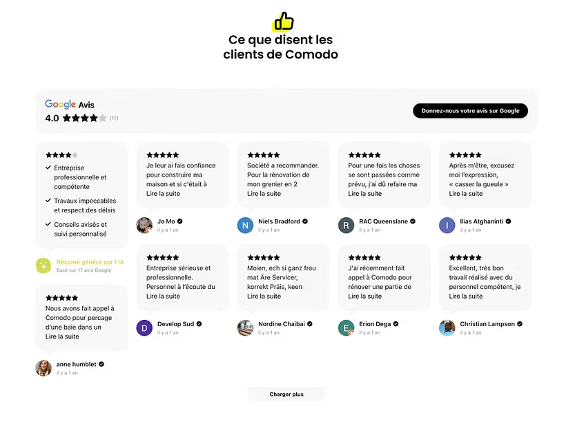 Les avis clients affichés sur votre fiche créent un puissant effet de preuve sociale. Un résumé IA vous permet de mettre en avant les points forts perçus par vos clients.