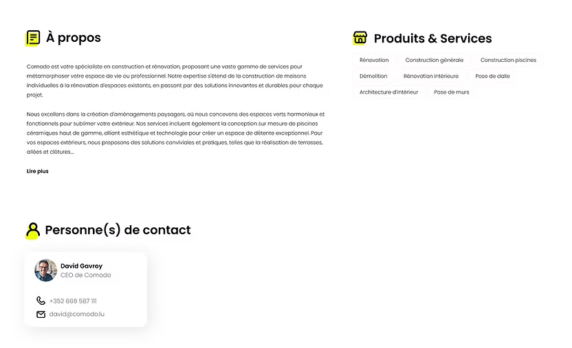 Le Guide Local Yelllow agit comme un boost de visibilité ciblée au Luxembourg, en complément de Google. Il renforce votre présence sur les moteurs de recherche et augmente vos chances d’apparaître dans les résultats enrichis générés par les IA (ChatGPT, Bard, Perplexity…).